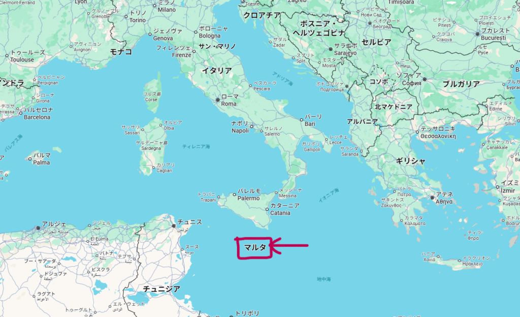 写真の矢印の部分ですね!シチリア島の下・地中海に位置する小さな島国です。